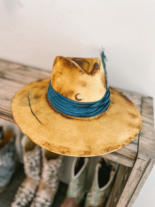 Wild West Charlie 1 Horse Burnt Yellow Hat | Burnt Hat | Vintage Hat | Distressed Hat | Western Burnt Hat | Burnt Fedora | Blue Feather Hat